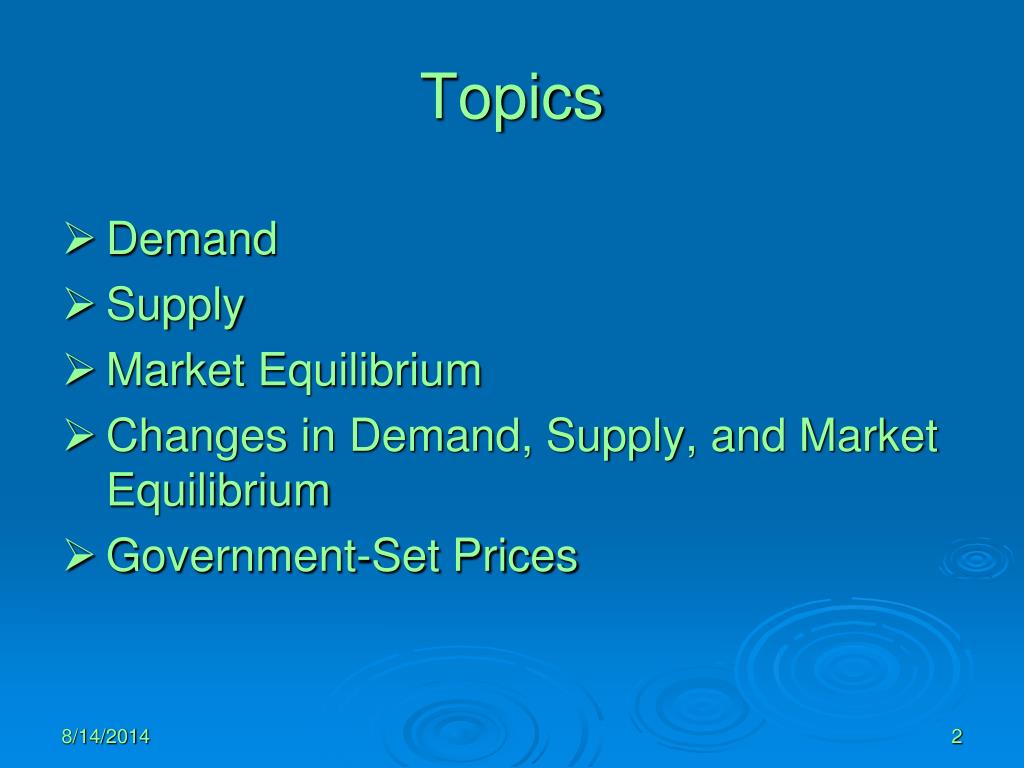 Topics • Demand • Supply • Market Equilibrium • Changes in Demand, Supply, and Market Equilibrium • Government-Set Prices