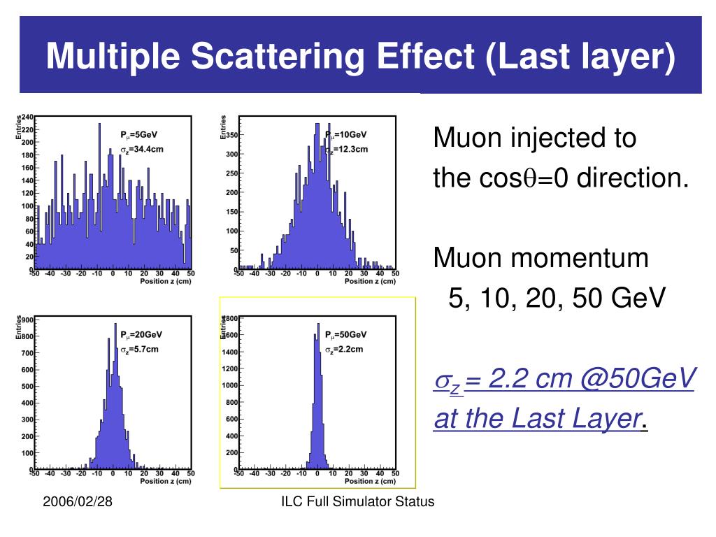 Multiple Scattering Effect (Last layer) Muon injected to the cosq=0 direction. Muon momentum 5, 10, 20, 50 GeV sz = 2.2 cm @50GeV at the Last Layer. ILC Full Simulator Status