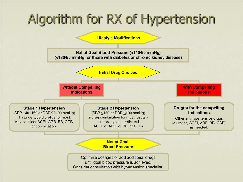 Without Compelling Indications With Compelling Indications Drug(s) for the compelling indications Other antihypertensive drugs (diuretics, ACEI, ARB, BB, CCB) as needed. Stage 1 Hypertension(SBP 140–159 or DBP 90–99 mmHg) Thiazide-type diuretics for most. May consider ACEI, ARB, BB, CCB, or combination. Stage 2 Hypertension(SBP >160 or DBP >100 mmHg) 2-drug combination for most (usually thiazide-type diuretic and ACEI, or ARB, or BB, or CCB) Not at Goal Blood Pressure Optimize dosages or add additional drugs until goal blood pressure is achieved.Consider consultation with hypertension specialist. Algorithm for RX of Hypertension Lifestyle Modifications Not at Goal Blood Pressure (<140/90 mmHg) (<130/80 mmHg for those with diabetes or chronic kidney disease) Initial Drug Choices