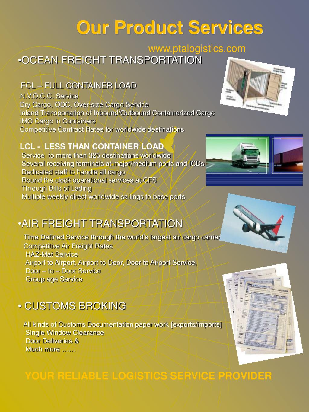 Our Product Services www.ptalogistics.com • OCEAN FREIGHT TRANSPORTATION • FCL – FULL CONTAINER LOAD • N.V.O.C.C. Service • Dry Cargo, ODC, Over-size Cargo Service • Inland Transportation of Inbound/Outbound Containerized Cargo • IMO Cargo in Containers • Competitive Contract Rates for worldwide destinations • LCL - LESS THAN CONTAINER LOAD • Service to more than 325 destinations worldwide • Several receiving terminals at major/medium ports and ICDs • Dedicated staff to handle all cargo • Round the clock operational services at CFS • Through Bills of Lading • Multiple weekly direct worldwide sailings to base ports • AIR FREIGHT TRANSPORTATION • Time Defined Service through the world’s largest air cargo carriers • Competitive Air Freight Rates • HAZ-Mat Service • Airport to Airport, Airport to Door, Door to Airport Service, • Door – to – Door Service • Group age Service • CUSTOMS BROKING • All kinds of Customs Documentation paper work [exports/imports] • Single Window Clearance • Door Deliveries & • Much more …… YOUR RELIABLE LOGISTICS SERVICE PROVIDER