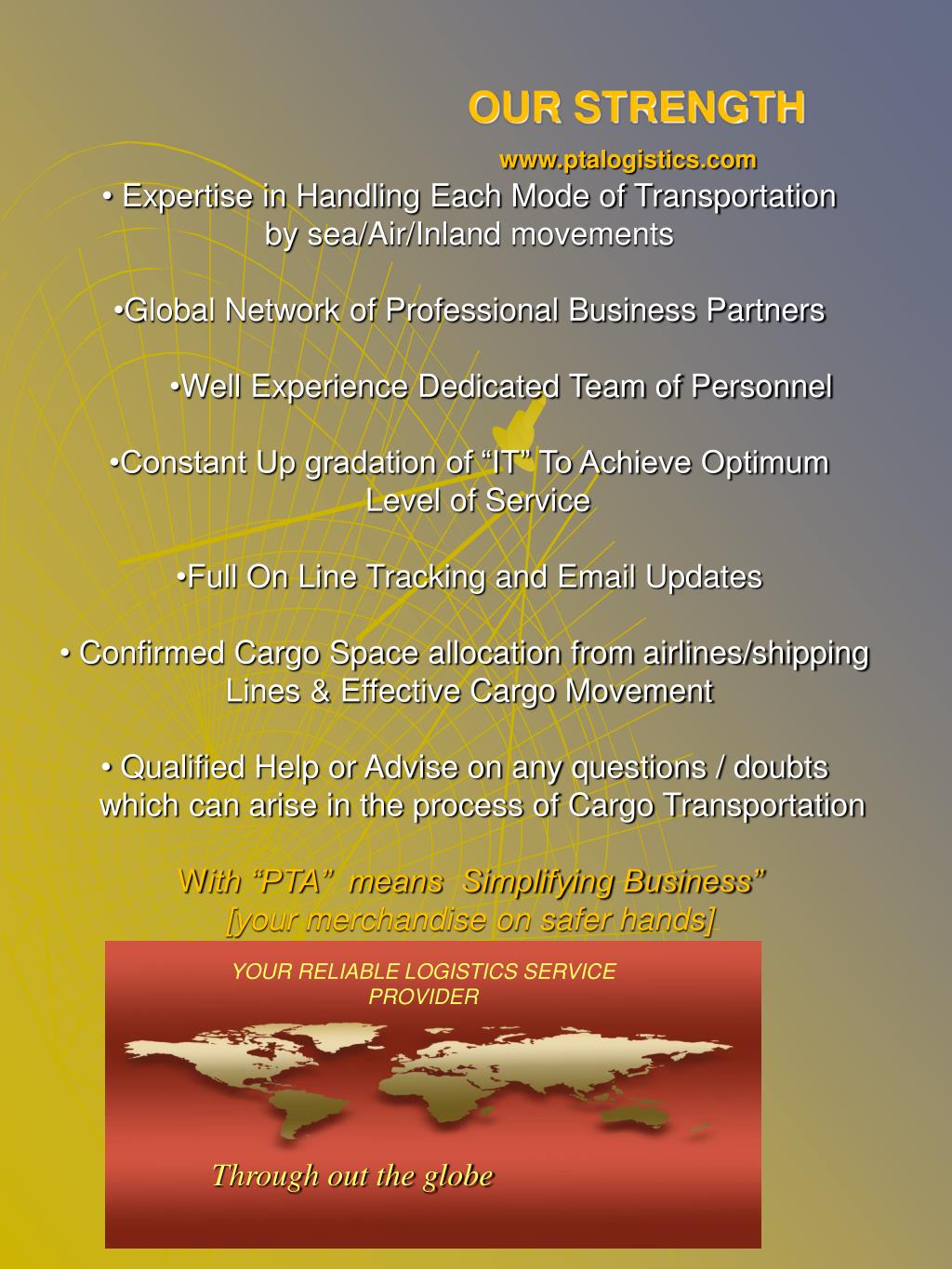 OUR STRENGTH www.ptalogistics.com • Expertise in Handling Each Mode of Transportation • by sea/Air/Inland movements • Global Network of Professional Business Partners • Well Experience Dedicated Team of Personnel • Constant Up gradation of “IT” To Achieve Optimum • Level of Service • Full On Line Tracking and Email Updates • Confirmed Cargo Space allocation from airlines/shipping • Lines & Effective Cargo Movement • Qualified Help or Advise on any questions / doubts • which can arise in the process of Cargo Transportation • With “PTA” means Simplifying Business” • [your merchandise on safer hands] YOUR RELIABLE LOGISTICS SERVICE PROVIDER Through out the globe
