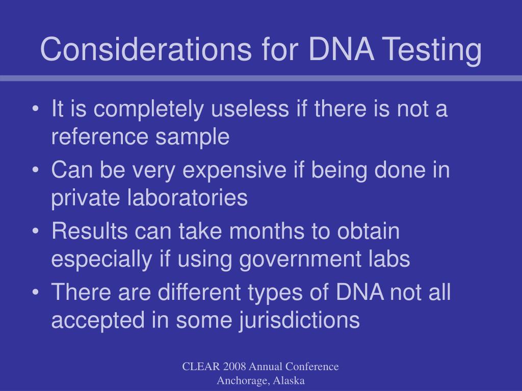 Considerations for DNA Testing • It is completely useless if there is not a reference sample • Can be very expensive if being done in private laboratories • Results can take months to obtain especially if using government labs • There are different types of DNA not all accepted in some jurisdictions CLEAR 2008 Annual Conference Anchorage, Alaska
