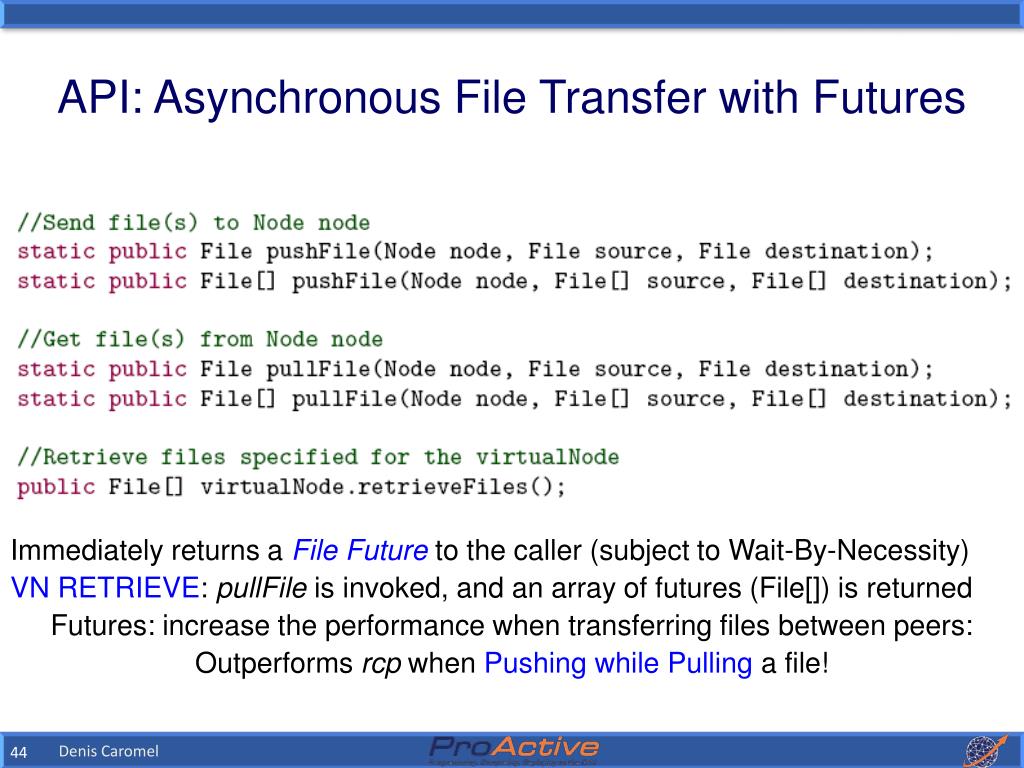 API: Asynchronous File Transfer with Futures • Immediately returns a File Future to the caller (subject to Wait-By-Necessity) • VN RETRIEVE: pullFile is invoked, and an array of futures (File[]) is returned • Futures: increase the performance when transferring files between peers: • Outperforms rcp when Pushing while Pulling a file! Denis Caromel