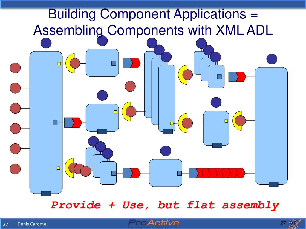 Building Component Applications =Assembling Components with XML ADL Provide + Use, but flat assembly 27 Denis Caromel
