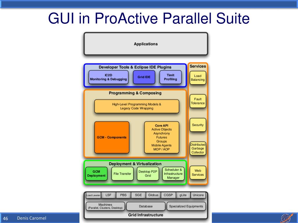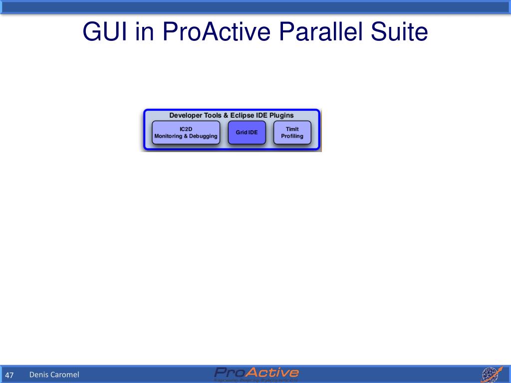 GCM features provided in ProActive: • GCM Fractal ADL (XML) • (Architecture Description Language) • GCM Management (Java, C, WSDL API) • GCM Application Description (XML) • GCM Interoperability Deployment (XML) Denis Caromel
