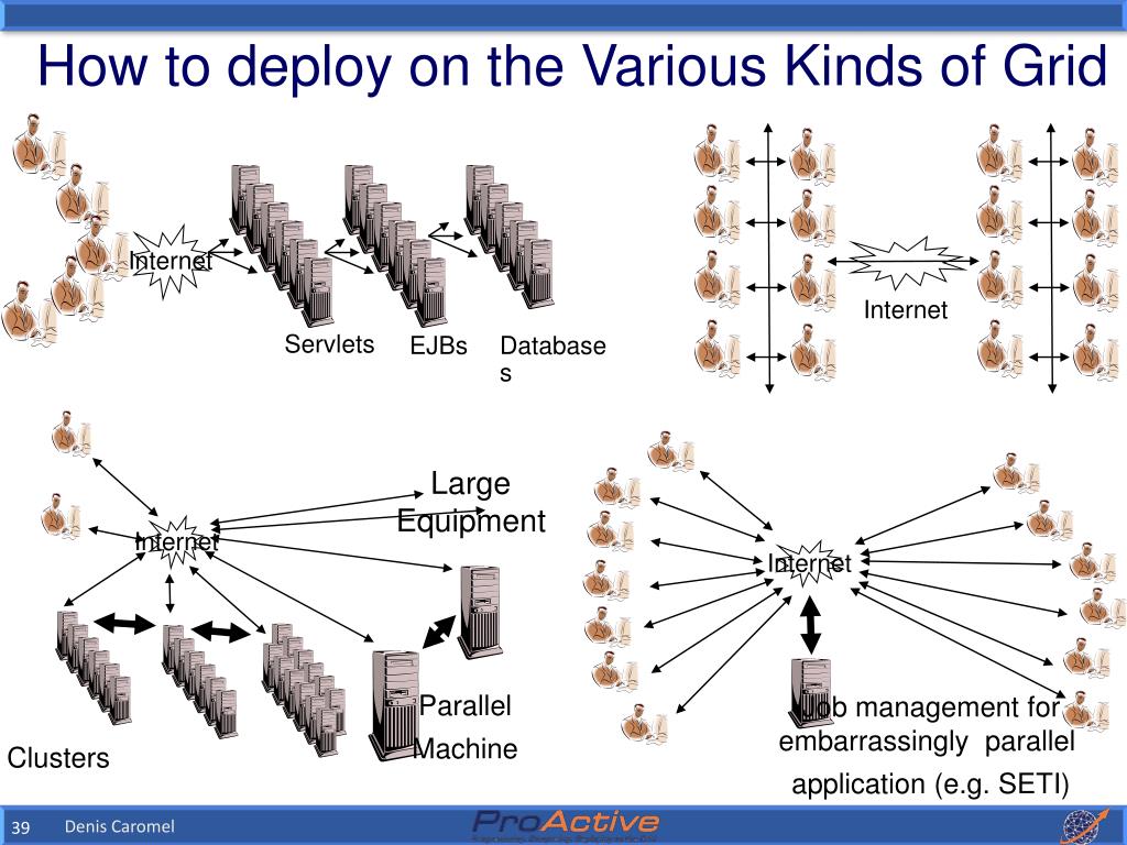 Large Equipment Internet Internet Internet Internet Servlets EJBs Databases Job management for embarrassingly parallel application (e.g. SETI) Parallel Machine Clusters How to deploy on the Various Kinds of Grid Denis Caromel
