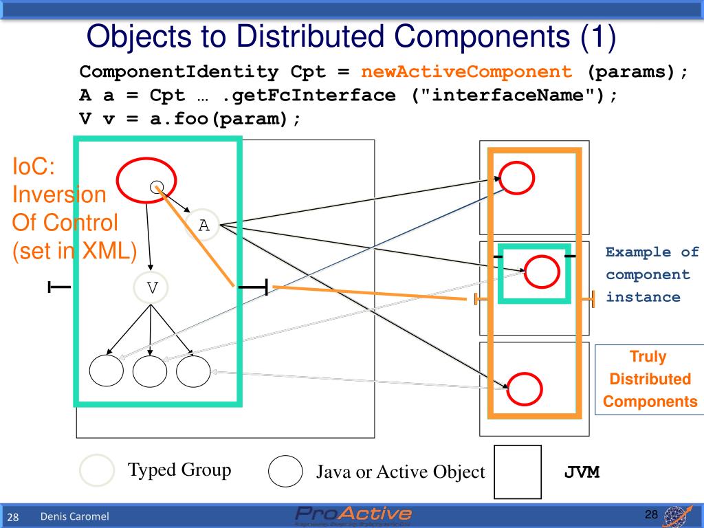 Objects to Distributed Components (1) ComponentIdentity Cpt =newActiveComponent (params); A a = Cpt … .getFcInterface ("interfaceName"); V v = a.foo(param); IoC: Inversion Of Control (set in XML) A Example of component instance V Truly Distributed Components Typed Group Java or Active Object JVM 28 Denis Caromel