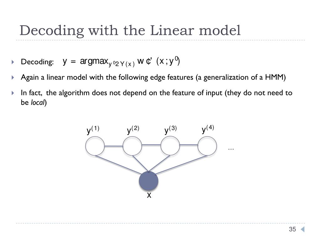 Decoding with the Linear model • Decoding: • Again a linear model with the following edge features (a generalization of a HMM) • In fact, the algorithm does not depend on the feature of input (they do not need to be local) … …
