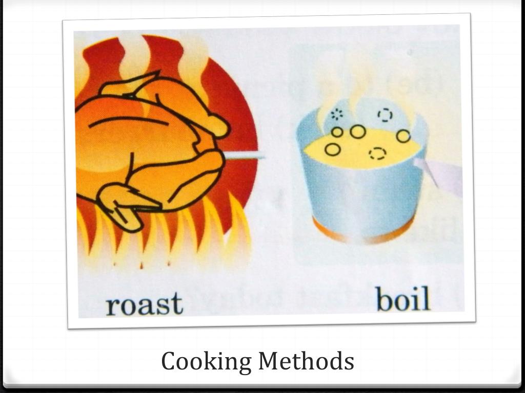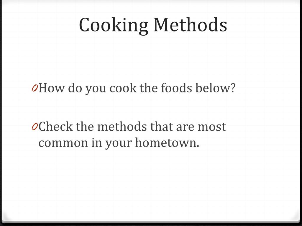 Cooking Methods • How do you cook the foods below? • Check the methods that are most common in your hometown.
