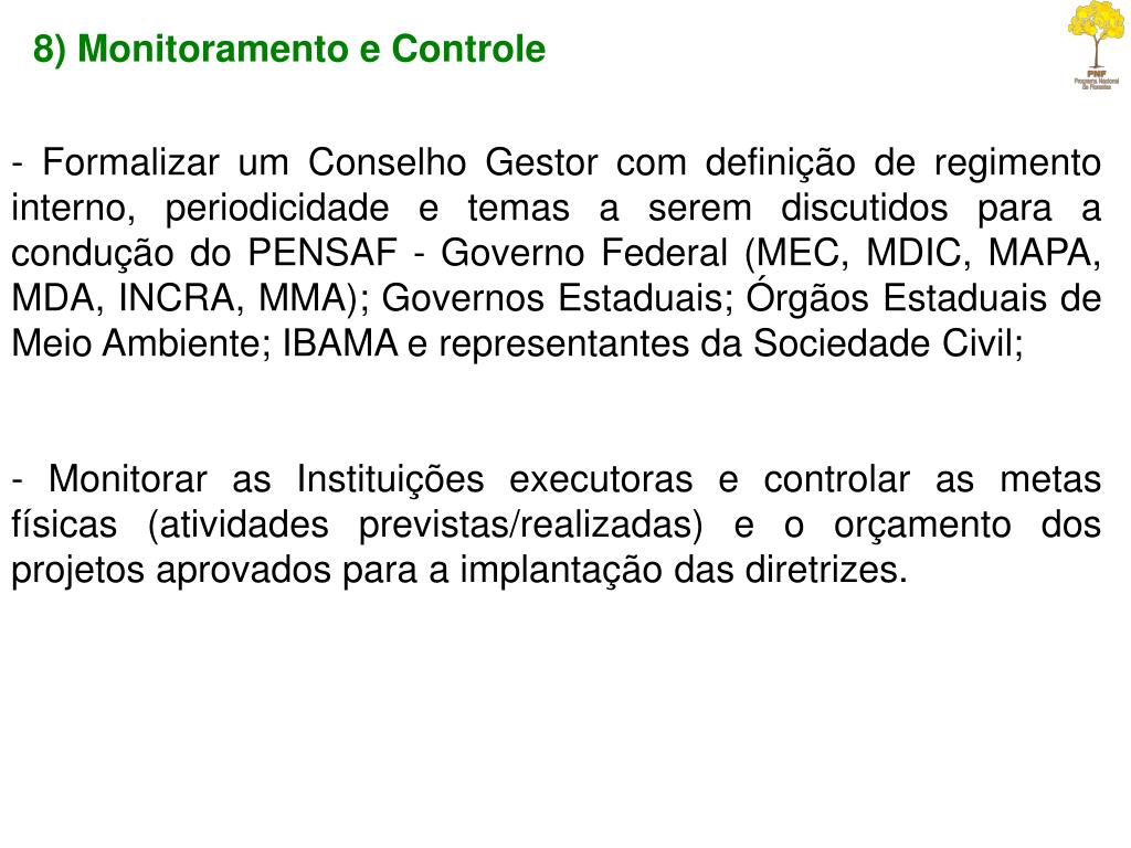 8) Monitoramento e Controle - Formalizar um Conselho Gestor com definição de regimento interno, periodicidade e temas a serem discutidos para a condução do PENSAF - Governo Federal (MEC, MDIC, MAPA, MDA, INCRA, MMA); Governos Estaduais; Órgãos Estaduais de Meio Ambiente; IBAMA e representantes da Sociedade Civil; - Monitorar as Instituições executoras e controlar as metas físicas (atividades previstas/realizadas) e o orçamento dos projetos aprovados para a implantação das diretrizes.