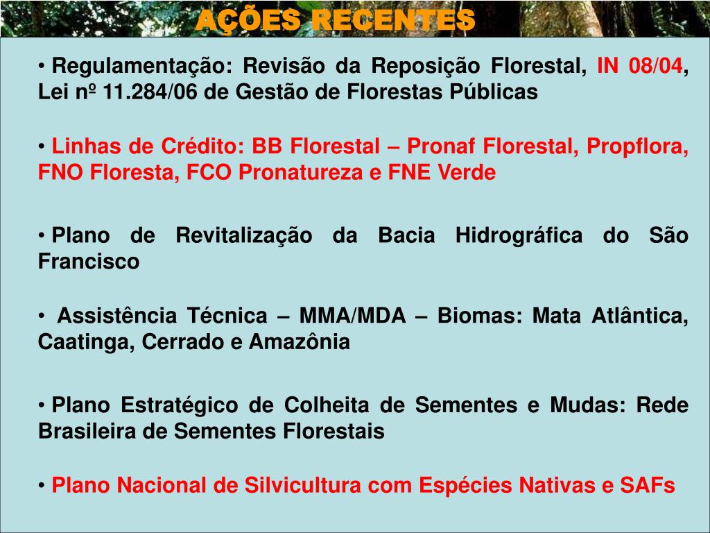 AÇÕES RECENTES • Regulamentação: Revisão da Reposição Florestal, IN 08/04, Lei nº 11.284/06 de Gestão de Florestas Públicas • Linhas de Crédito: BB Florestal – Pronaf Florestal, Propflora, FNO Floresta, FCO Pronatureza e FNE Verde • Plano de Revitalização da Bacia Hidrográfica do São Francisco • Assistência Técnica – MMA/MDA – Biomas: Mata Atlântica, Caatinga, Cerrado e Amazônia • Plano Estratégico de Colheita de Sementes e Mudas: Rede Brasileira de Sementes Florestais • Plano Nacional de Silvicultura com Espécies Nativas e SAFs