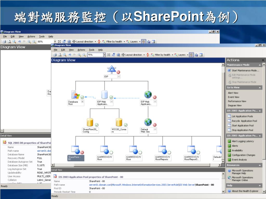 端對端服務監控(以AD為例) • 監控DC、GC、Operations Master 健康狀態 • 監控DC間的複寫效能、複寫健康狀態 • 監控目錄服務的資料庫、交易記錄檔的成長 • 提供超過四百種以上知識庫