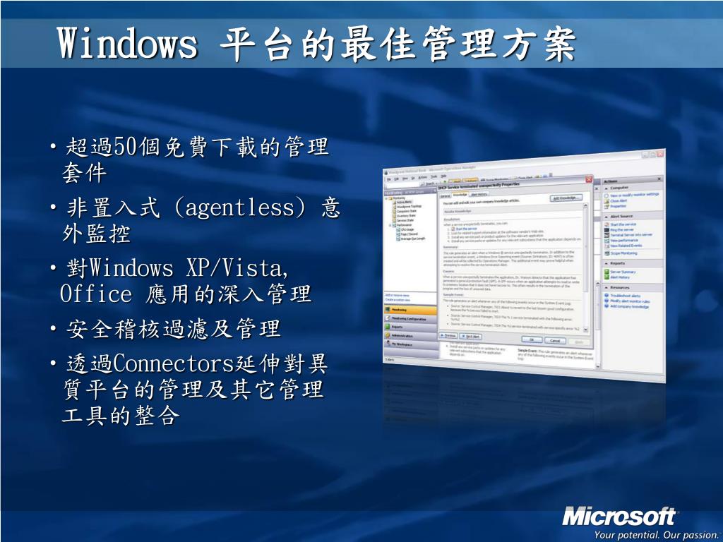 超過50個免費下載的管理套件 非置入式 (agentless) 意外監控 對Windows XP/Vista, Office 應用的深入管理 安全稽核過濾及管理 透過Connectors延伸對異質平台的管理及其它管理工具的整合 Windows 平台的最佳管理方案