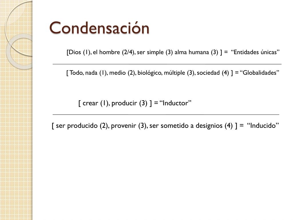 Condensación [Dios (1), el hombre (2/4), ser simple (3) alma humana (3) ] = “Entidades únicas” [ Todo, nada (1), medio (2), biológico, múltiple (3), sociedad (4) ] = “Globalidades” [ crear (1), producir (3) ] = “Inductor” [ ser producido (2), provenir (3), ser sometido a designios (4) ] = “Inducido”