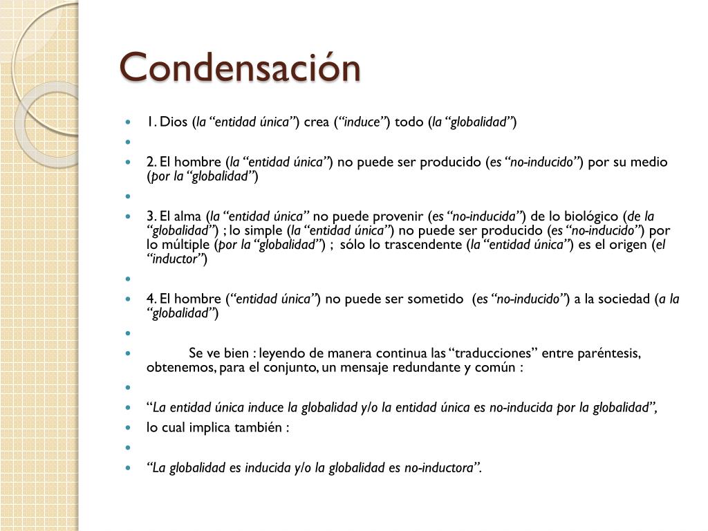 Condensación • 1. Dios (la “entidad única”) crea (“induce”) todo (la “globalidad”) • 2. El hombre (la “entidad única”) no puede ser producido (es “no-inducido”) por su medio (por la “globalidad”) • 3. El alma (la “entidad única” no puede provenir (es “no-inducida”) de lo biológico (de la “globalidad”) ; lo simple (la “entidad única”) no puede ser producido (es “no-inducido”) por lo múltiple (por la “globalidad”) ; sólo lo trascendente (la “entidad única”) es el origen (el “inductor”) • 4. El hombre (“entidad única”) no puede ser sometido (es “no-inducido”) a la sociedad (a la “globalidad”) • Se ve bien : leyendo de manera continua las “traducciones” entre paréntesis, obtenemos, para el conjunto, un mensaje redundante y común : • “La entidad única induce la globalidad y/o la entidad única es no-inducida por la globalidad”, • lo cual implica también : • “La globalidad es inducida y/o la globalidad es no-inductora”.