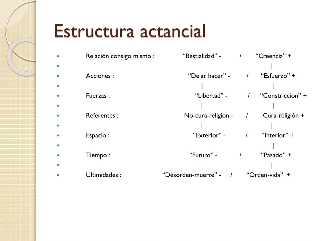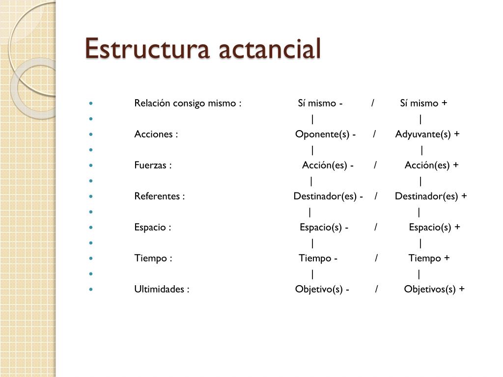 Estructura actancial • Relación consigo mismo : Sí mismo - / Sí mismo + • | | • Acciones : Oponente(s) - / Adyuvante(s) + • | | • Fuerzas : Acción(es) - / Acción(es) + • | | • Referentes : Destinador(es) - / Destinador(es) + • | | • Espacio : Espacio(s) - / Espacio(s) + • | | • Tiempo : Tiempo - / Tiempo + • | | • Ultimidades : Objetivo(s) - / Objetivos(s) +