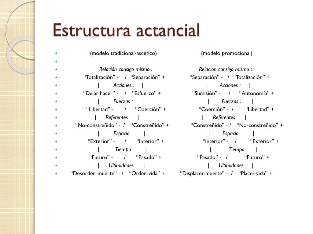 Estructura actancial • (modelo tradicional-ascético) (modelo promocional) • Relación consigo mismo : Relación consigo mismo : • “Totalización” - / “Separación” + “Separación” - / “Totalización” + • | Acciones : | | Acciones : | • “Dejar hacer” - / “Esfuerzo” + “Sumisión” - / “Autonomía” + • | Fuerzas : | | Fuerzas : | • “Libertad” - / “Coerción” + “Coerción” - / “Libertad” + • | Referentes | | Referentes | • “No-constreñido” - / “Constreñido” + “Constreñido” - / “No-constreñido” + • | Espacio | | Espacio | • “Exterior” - / “Interior” + “Interior” - / “Exterior” + • | Tiempo | | Tiempo | • “Futuro” - / “Pasado” + “Pasado” - / “Futuro” + • | Ultimidades | | Ultimidades | • “Desorden-muerte” - / “Orden-vida” + “Displacer-muerte” - / “Placer-vida” +