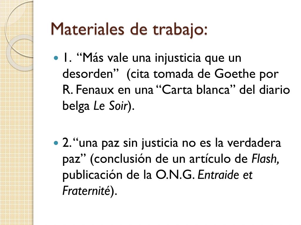 Materiales de trabajo: • 1. “Más vale una injusticia que un desorden” (cita tomada de Goethe por R. Fenaux en una “Carta blanca” del diario belga Le Soir). • 2. “una paz sin justicia no es la verdadera paz” (conclusión de un artículo de Flash, publicación de la O.N.G. Entraide et Fraternité).