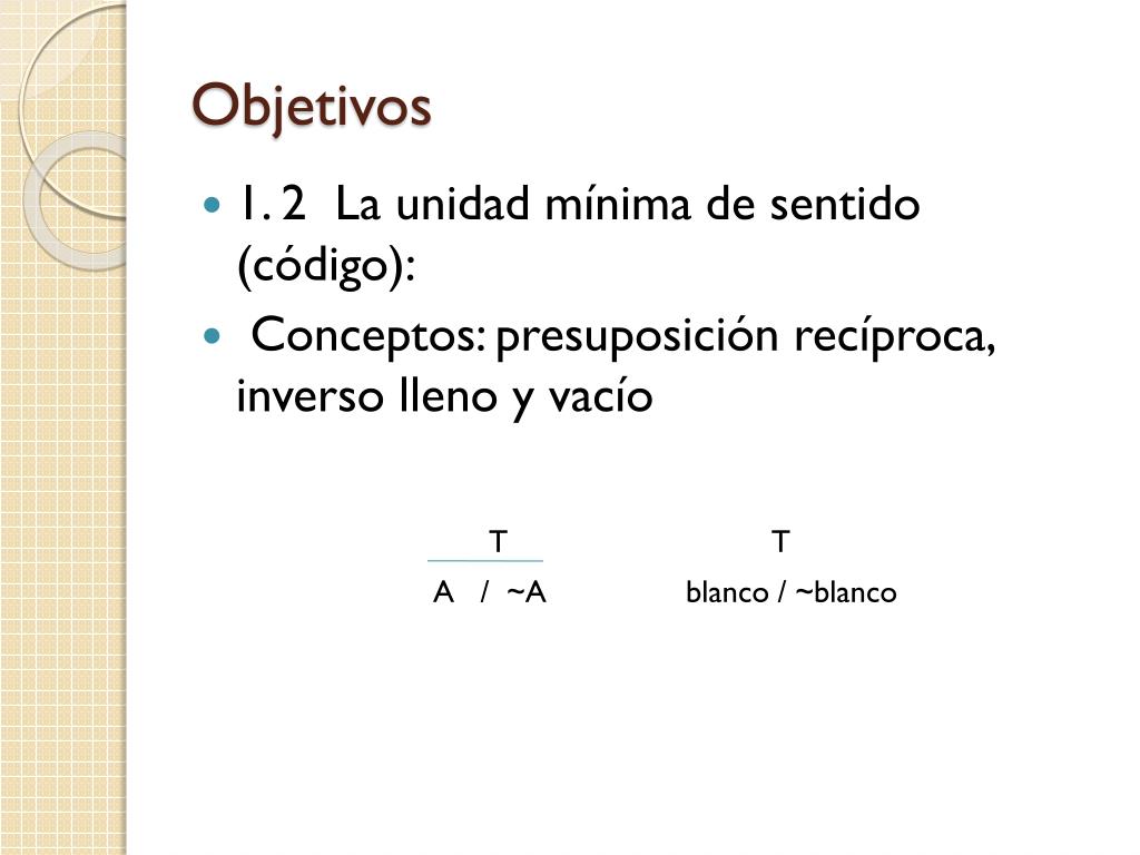 Objetivos • 1. 2 La unidad mínima de sentido (código): • Conceptos: presuposición recíproca, inverso lleno y vacío TT A / ~A blanco / ~blanco