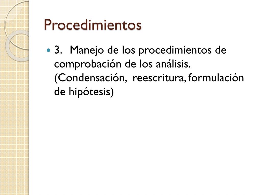 Procedimientos • 3. Manejo de los procedimientos de comprobación de los análisis. (Condensación, reescritura, formulación de hipótesis)