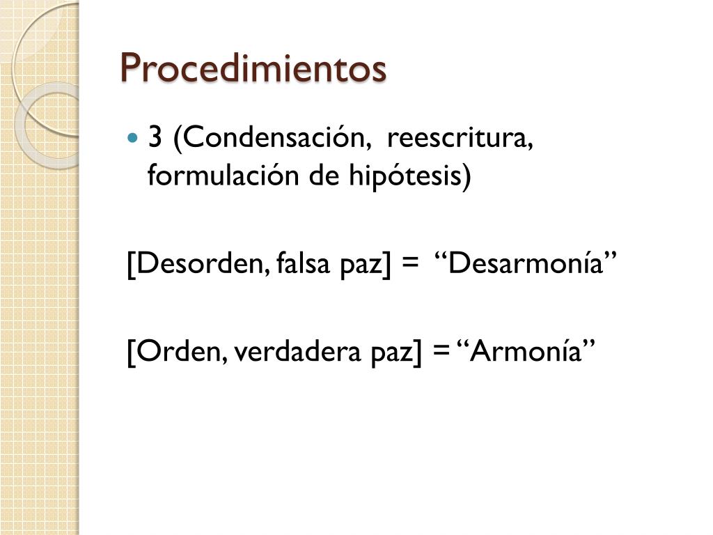 Procedimientos • 3 (Condensación, reescritura, formulación de hipótesis) [Desorden, falsa paz] = “Desarmonía” [Orden, verdadera paz] = “Armonía”