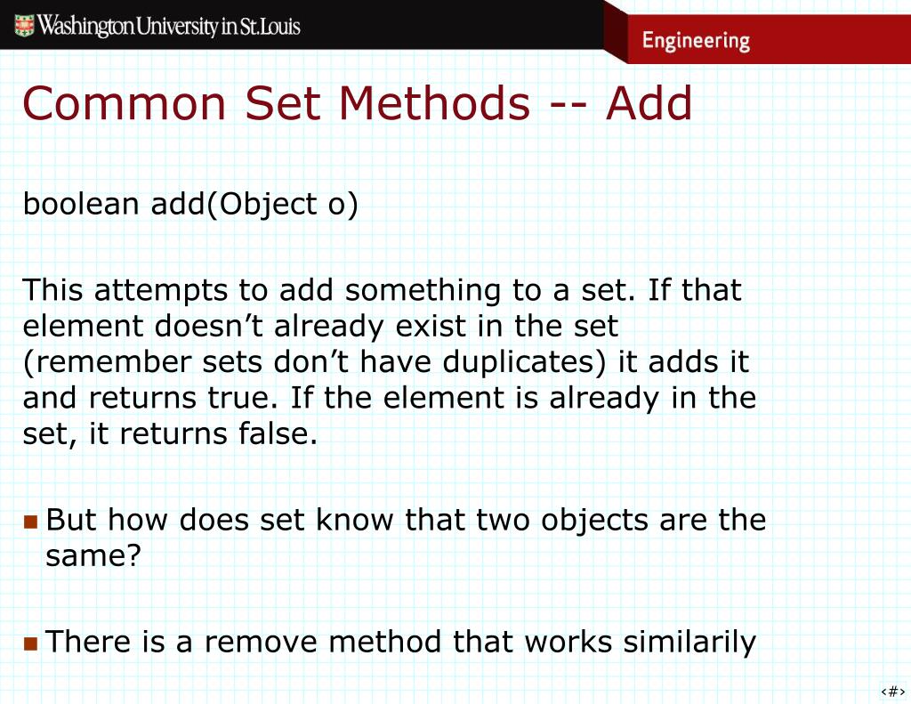 Common Set Methods -- Add boolean add(Object o) This attempts to add something to a set. If that element doesn’t already exist in the set (remember sets don’t have duplicates) it adds it and returns true. If the element is already in the set, it returns false. • But how does set know that two objects are the same? • There is a remove method that works similarily