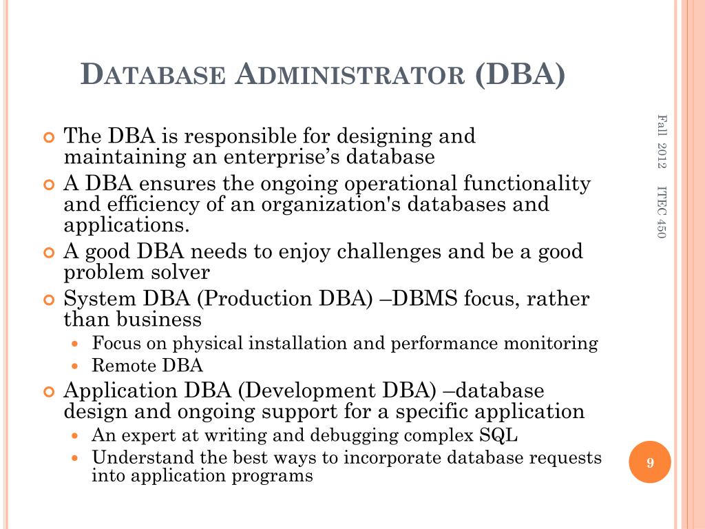 Database Administrator (DBA) • The DBA is responsible for designing and maintaining an enterprise’s database • A DBA ensures the ongoing operational functionality and efficiency of an organization's databases and applications. • A good DBA needs to enjoy challenges and be a good problem solver • System DBA (Production DBA) –DBMS focus, rather than business • Focus on physical installation and performance monitoring • Remote DBA • Application DBA (Development DBA) –database design and ongoing support for a specific application • An expert at writing and debugging complex SQL • Understand the best ways to incorporate database requests into application programs ITEC 450