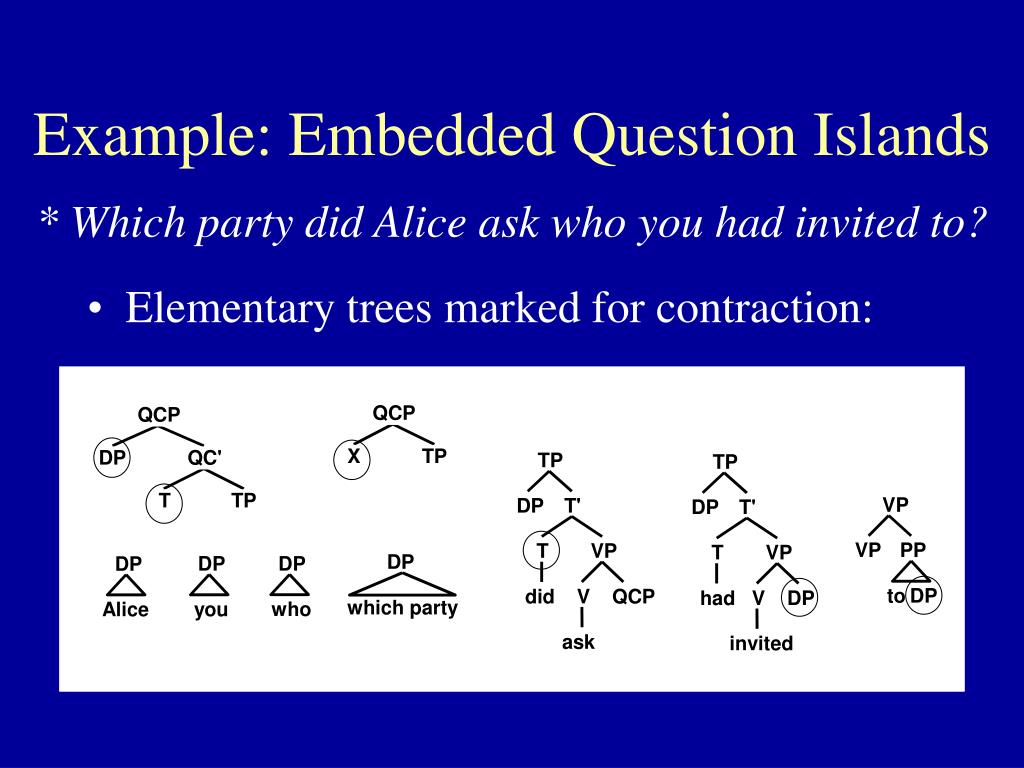 Example: Embedded Question Islands *Which party did Alice ask who you had invited to? • Elementary trees marked for contraction: