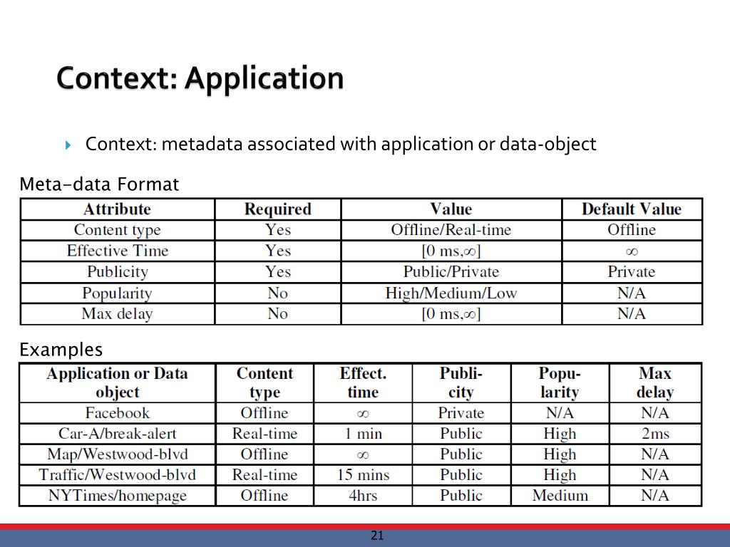 Context: Network Conditions • Associated with Node Metadata • Locally maintained and generated by nodes • Location: GPS coordinates • Neighbor list • Maintained by overhearing the ongoing traffic • Out-of-contact node list • Implicitly detected by observing the retransmission failures towards known destinations • Nodes can: • Retrieve app and net metadata from data chunks • Explicitly request metadata