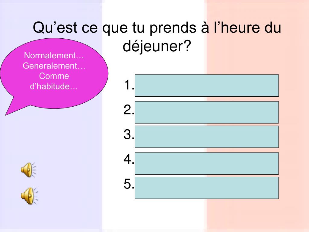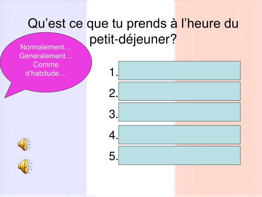 Qu’est ce que tu prends à l’heure du petit-déjeuner? Normalement… Generalement… Comme d’habitude… • Je bois un jus d’orange • Je mange du pain grillé • Je prends un yaourt • Je bois du lait • Je ne prends rien