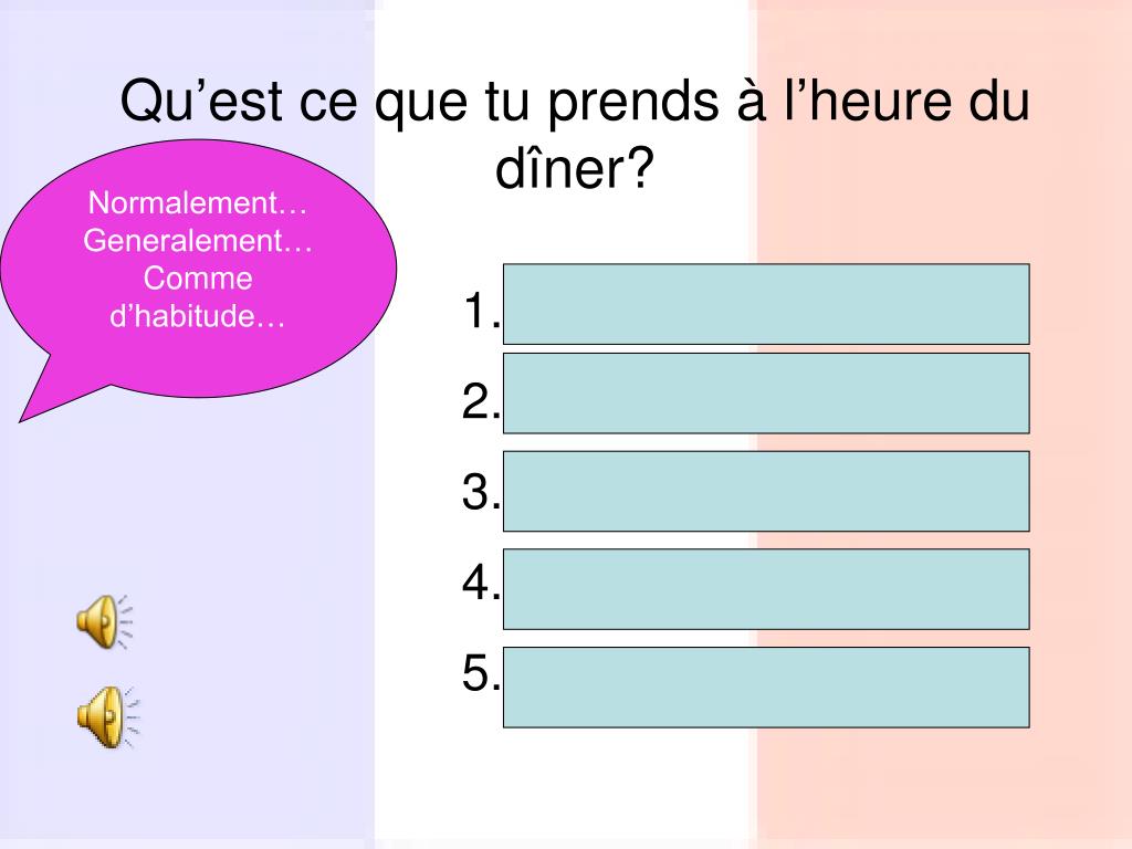 Qu’est ce que tu prends à l’heure du dîner? Normalement… Generalement… Comme d’habitude… • Je mange du pizza • Je prends des céréales • Je mange de la viande • Je mange du pâtes • Je bois de la limonade
