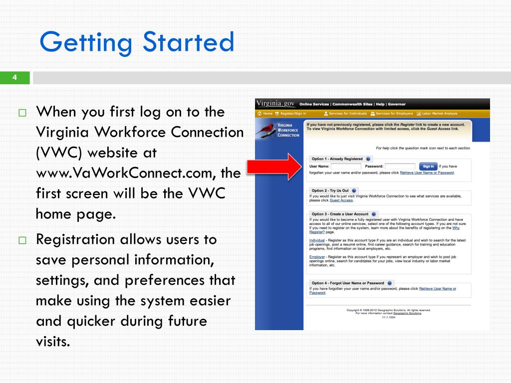 Getting Started • When you first log on to the Virginia Workforce Connection (VWC) website at www.VaWorkConnect.com, the first screen will be the VWC home page. • Registration allows users to save personal information, settings, and preferences that make using the system easier and quicker during future visits.
