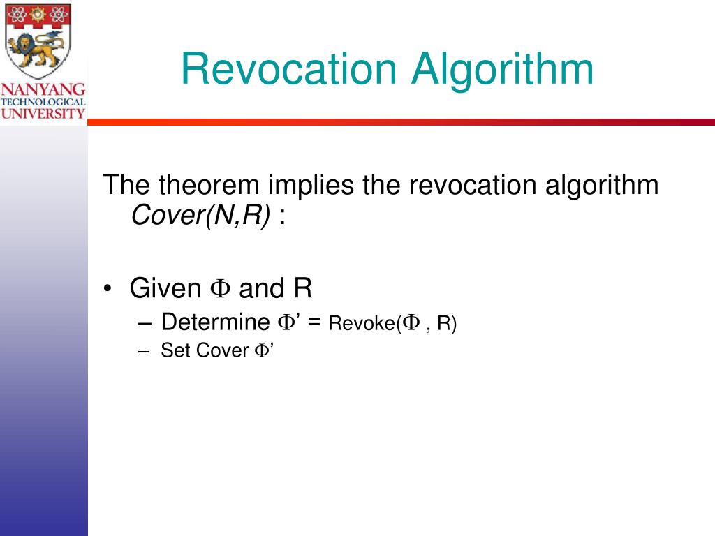 Revocation Algorithm The theorem implies the revocation algorithm Cover(N,R) : • Given and R • Determine ’ = Revoke( , R) • Set Cover ’
