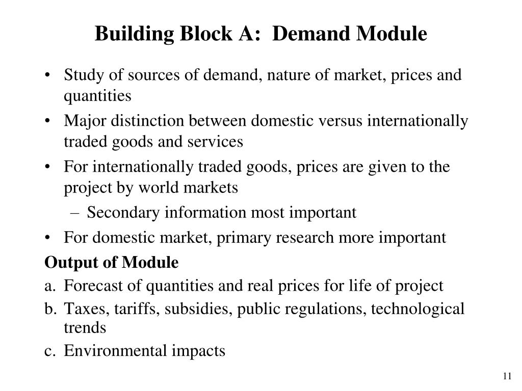 Building Block A: Demand Module • Study of sources of demand, nature of market, prices and quantities • Major distinction between domestic versus internationally traded goods and services • For internationally traded goods, prices are given to the project by world markets • Secondary information most important • For domestic market, primary research more important Output of Module • Forecast of quantities and real prices for life of project • Taxes, tariffs, subsidies, public regulations, technological trends c. Environmental impacts