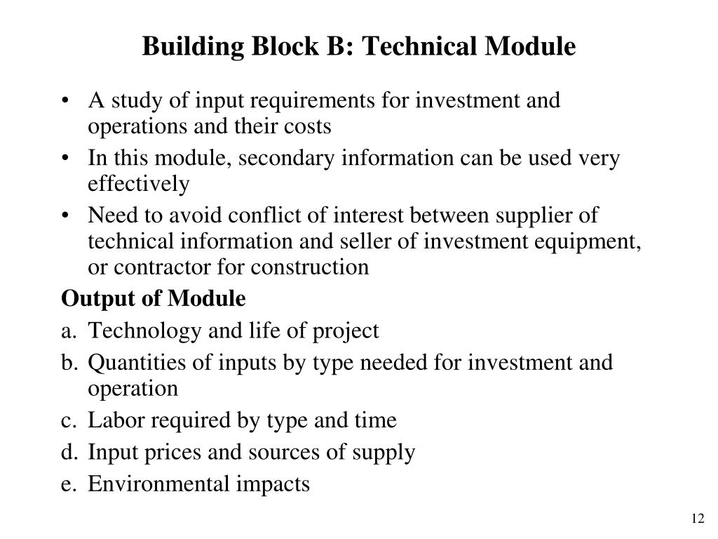 Building Block B: Technical Module • A study of input requirements for investment and operations and their costs • In this module, secondary information can be used very effectively • Need to avoid conflict of interest between supplier of technical information and seller of investment equipment, or contractor for construction Output of Module • Technology and life of project • Quantities of inputs by type needed for investment and operation • Labor required by type and time • Input prices and sources of supply e. Environmental impacts