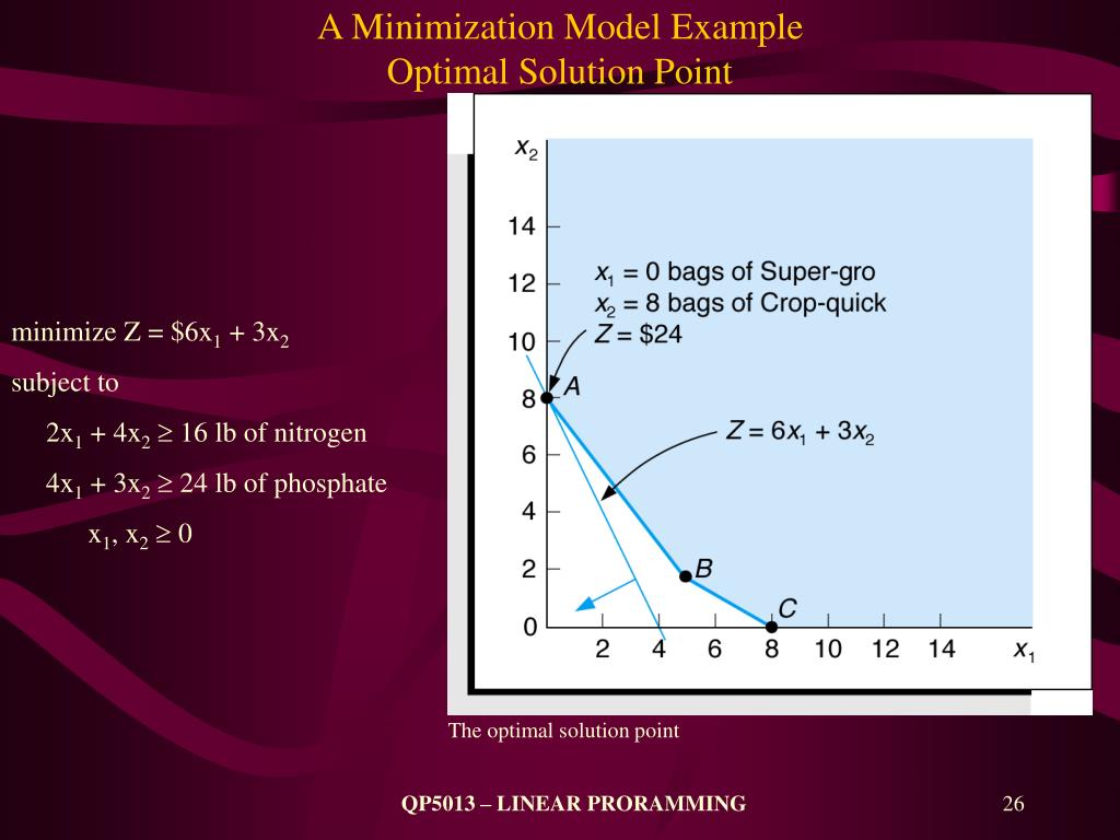 A Minimization Model ExampleComplete Model Formulation and Constraint Graph Complete model formulation: minimize Z = $6x1 + 3x2 subject to 2x1 + 4x2 16 lb of nitrogen 4x1 + 3x2 24 lb of phosphate x1, x2 0 QP5013 – LINEAR PRORAMMING