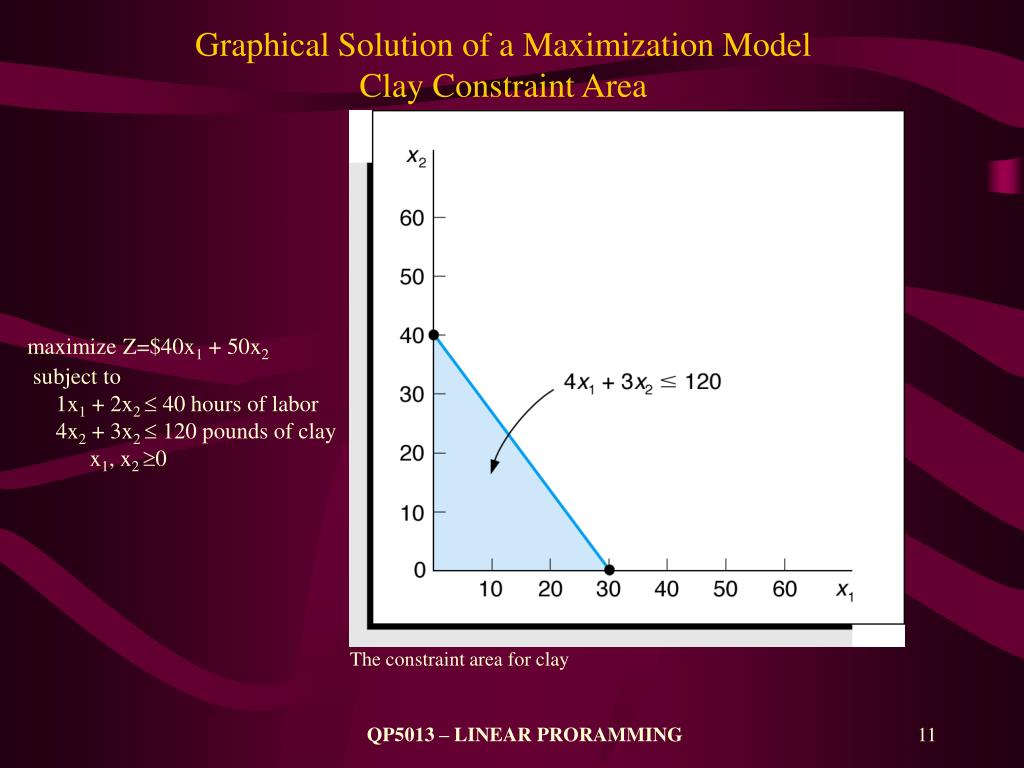 Graphical Solution of a Maximization Model Labor Constraint maximize Z=$40x1 + 50x2 subject to 1x1 + 2x2 40 hours of labor 4x2 + 3x2 120 pounds of clay x1, x2 0 Graph of the labor constraint line QP5013 – LINEAR PRORAMMING