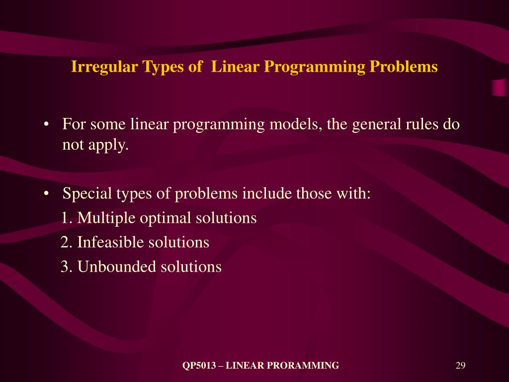 Irregular Types of Linear Programming Problems • For some linear programming models, the general rules do not apply. • Special types of problems include those with: 1. Multiple optimal solutions 2. Infeasible solutions 3. Unbounded solutions QP5013 – LINEAR PRORAMMING