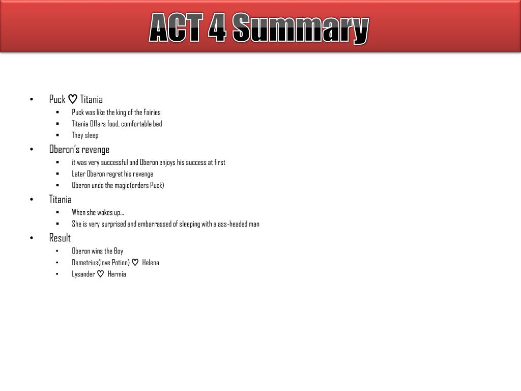 ACT 4 Summary • Puck ♡ Titania • Puck was like the king of the Fairies • Titania Offers food, comfortable bed • They sleep • Oberon’s revenge • it was very successful and Oberon enjoys his success at first • Later Oberon regret his revenge • Oberon undo the magic(orders Puck) • Titania • When she wakes up… • She is very surprised and embarrassed of sleeping with a ass-headed man • Result • Oberon wins the Boy • Demetrius(love Potion) ♡ Helena • Lysander ♡ Hermia
