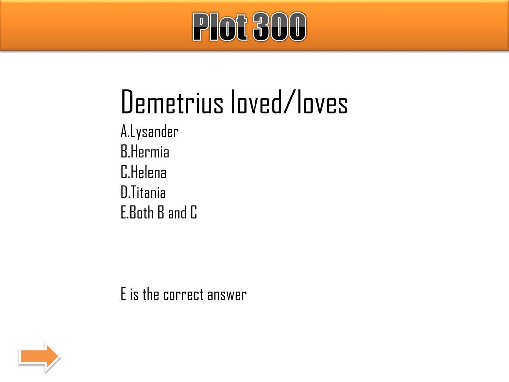 Plot 300 • Demetrius loved/loves • Lysander • Hermia • Helena • Titania • Both B and C E is the correct answer