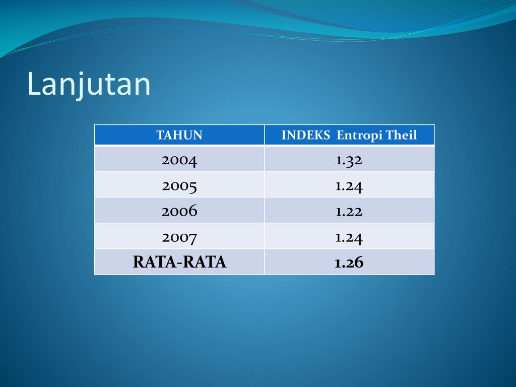 Lanjutan 2. Indekskesenjangan Entropy Theilmenunjukkankecenderunganpeningkatankesenjangan/ketimpangandaritahun 2006 sampaitahun 2007. Padatahun 2004 nilaiindeks Entropy Theilsebesar 1,32 padaperiodetahun 2005 nilaiindeks Entropy Theil 1,24 padatahun 2006 mengalamipenurunanmenjadi 1,22, danpadatahun 2007 mengalamipeningkatansehingganilaiindeks Entropy Theilnyamenjadi 1,24.