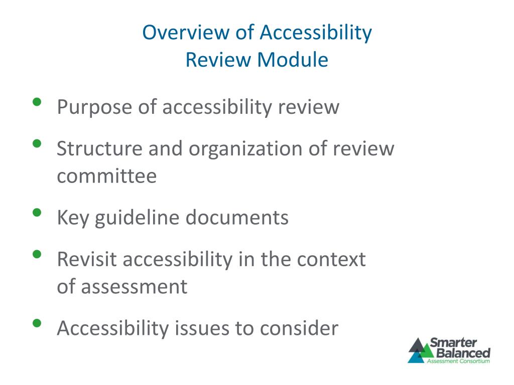 Accessibility Review Training Module. Overview of Accessibility Review Module. Purpose of accessibility review Structure and organization of review committee Key guideline documents Revisit accessibility in the context of assessment Accessibility issues to consider .