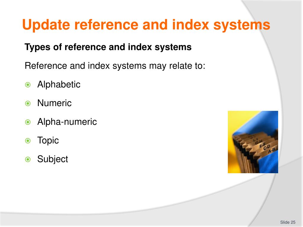 Update reference and index systems Role of the reference and index systems Implementing a reference and index system enables you to file and then readily access paper-based documents: • What reference and index systems can you use?