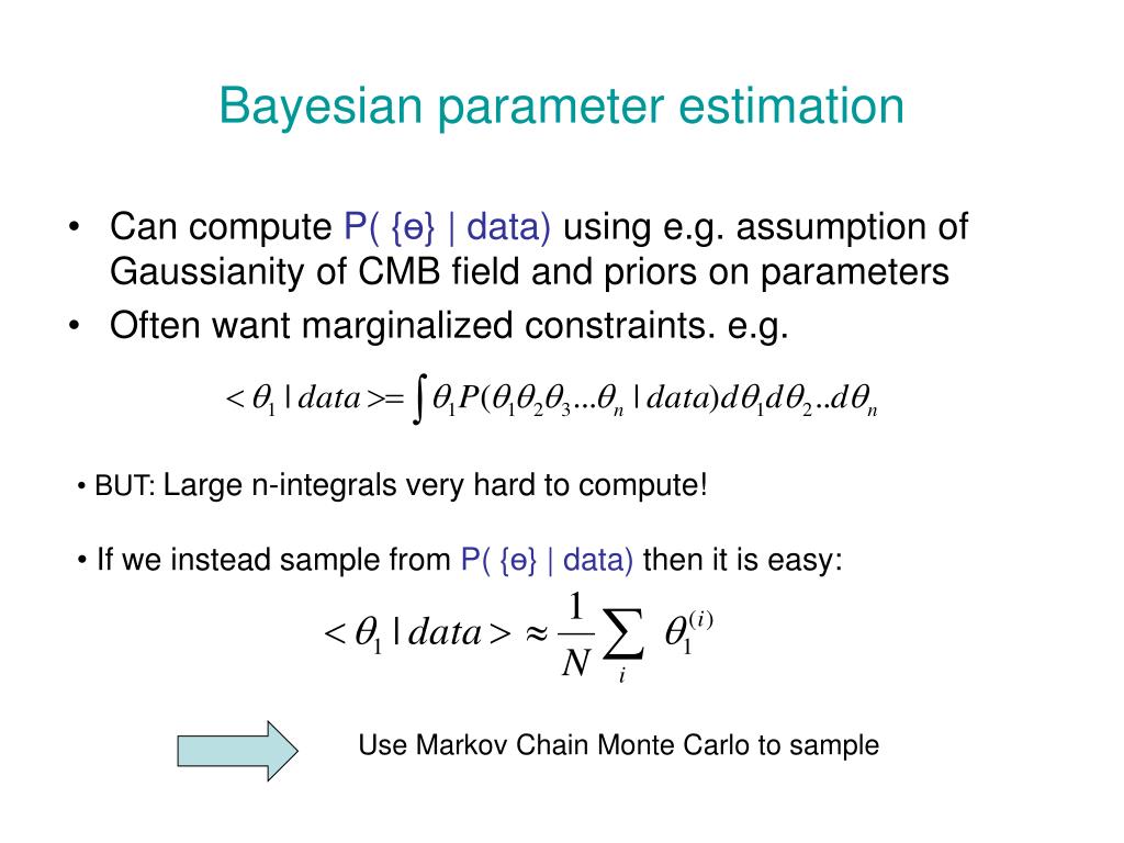 Bayesian parameter estimation • Can compute P( {ө} | data) using e.g. assumption of Gaussianity of CMB field and priors on parameters • Often want marginalized constraints. e.g. • BUT: Large n-integrals very hard to compute! • If we instead sample from P( {ө} | data) then it is easy: Use Markov Chain Monte Carlo to sample