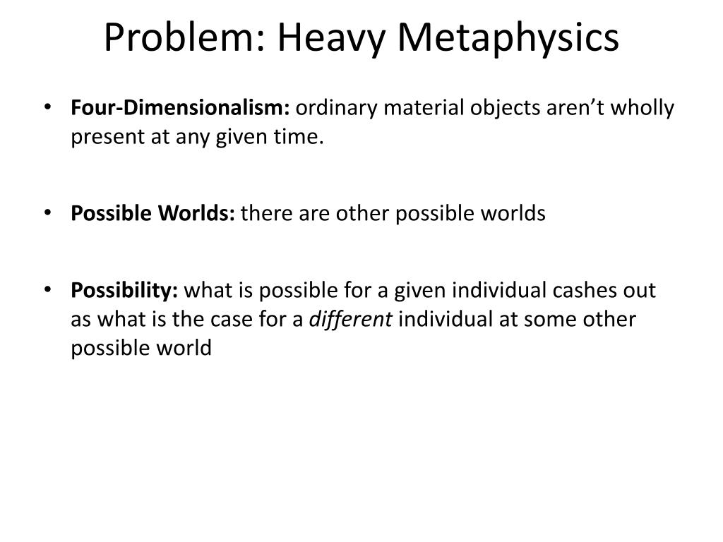 Problem: Heavy Metaphysics • Four-Dimensionalism: ordinary material objects aren’t wholly present at any given time. • Possible Worlds: there are other possible worlds • Possibility: what is possible for a given individual cashes out as what is the case for a different individual at some other possible world