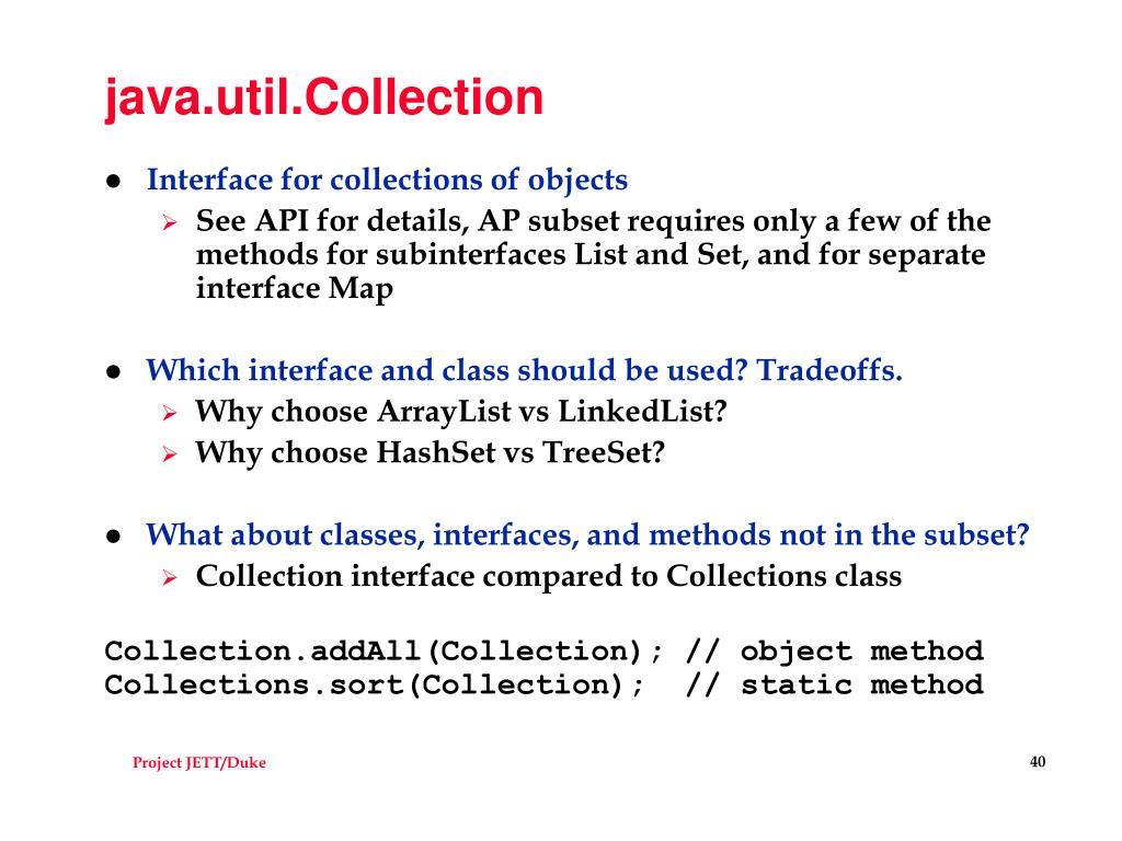 java.util.Collection • Interface for collections of objects • See API for details, AP subset requires only a few of the methods for subinterfaces List and Set, and for separate interface Map • Which interface and class should be used? Tradeoffs. • Why choose ArrayList vs LinkedList? • Why choose HashSet vs TreeSet? • What about classes, interfaces, and methods not in the subset? • Collection interface compared to Collections class Collection.addAll(Collection); // object method Collections.sort(Collection); // static method