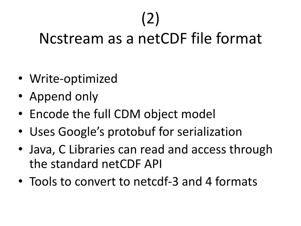 (2) Ncstream as a netCDF file format • Write-optimized • Append only • Encode the full CDM object model • Uses Google’s protobuf for serialization • Java, C Libraries can read and access through the standard netCDF API • Tools to convert to netcdf-3 and 4 formats