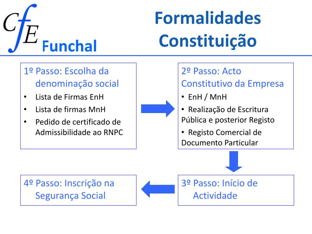 Formalidades Constituição Funchal 2º Passo: Acto Constitutivo da Empresa • EnH / MnH • Realização de Escritura Pública e posterior Registo • Registo Comercial de Documento Particular 4º Passo: Inscrição na Segurança Social 3º Passo: Início de Actividade 1º Passo: Escolha da denominação social Lista de Firmas EnH Lista de firmas MnH Pedido de certificado de Admissibilidade ao RNPC