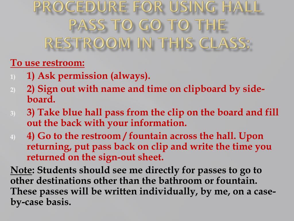 Procedure for using hall pass to go to the restroom in this class: To use restroom: 1) Ask permission (always). 2) Sign out with name and time on clipboard by side-board. 3) Take blue hall pass from the clip on the board and fill out the back with your information. 4) Go to the restroom / fountain across the hall. Upon returning, put pass back on clip and write the time you returned on the sign-out sheet. Note: Students should see me directly for passes to go to other destinations other than the bathroom or fountain. These passes will be written individually, by me, on a case-by-case basis.