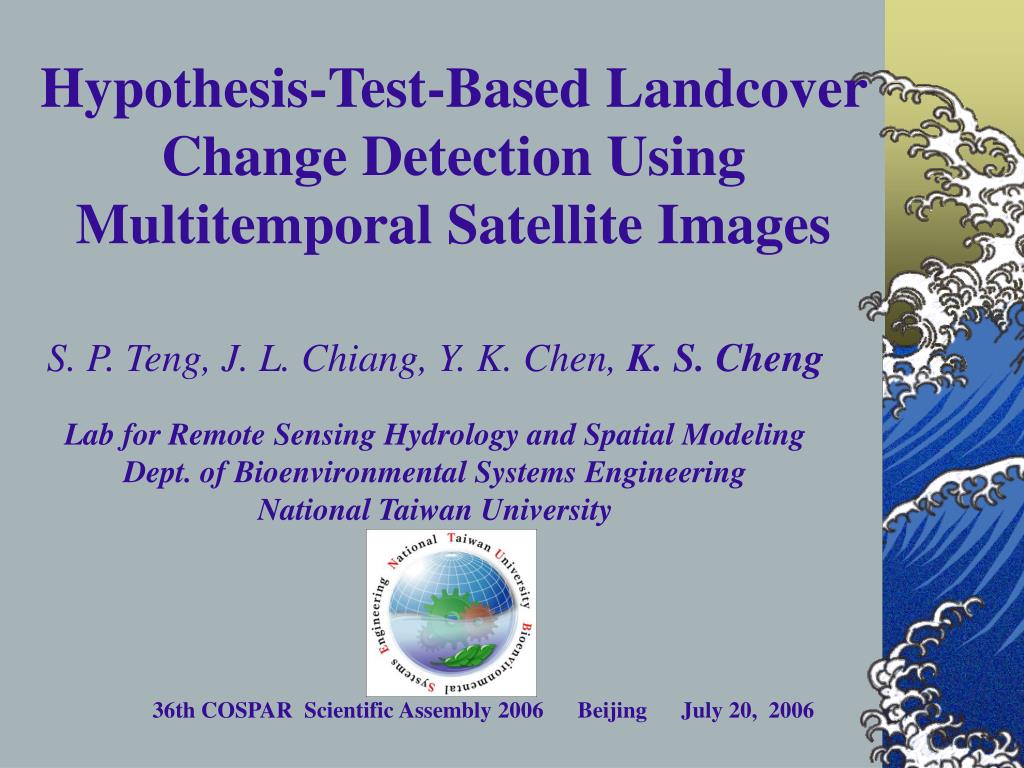 Hypothesis-Test-Based Landcover Change Detection Using Multitemporal Satellite Images S. P. Teng, J. L. Chiang, Y. K. Chen, K. S. Cheng Lab for Remote Sensing Hydrology and Spatial Modeling Dept. of Bioenvironmental Systems Engineering National Taiwan University 36th COSPAR Scientific Assembly 2006 Beijing July 20, 2006